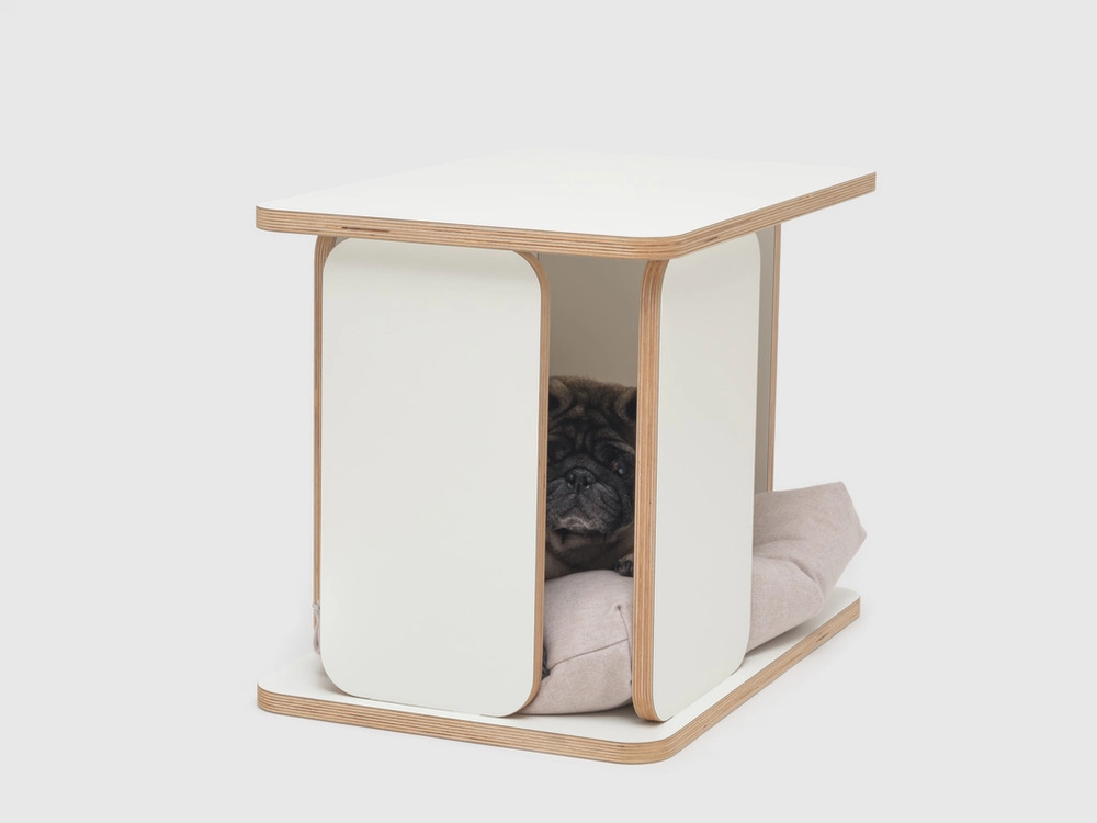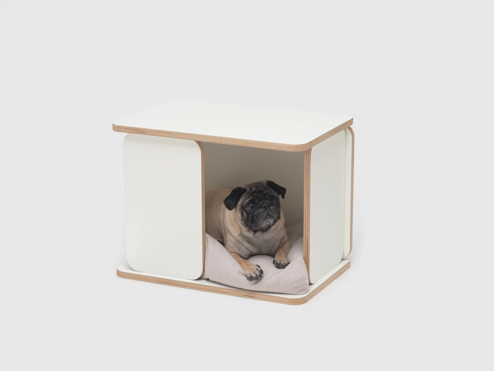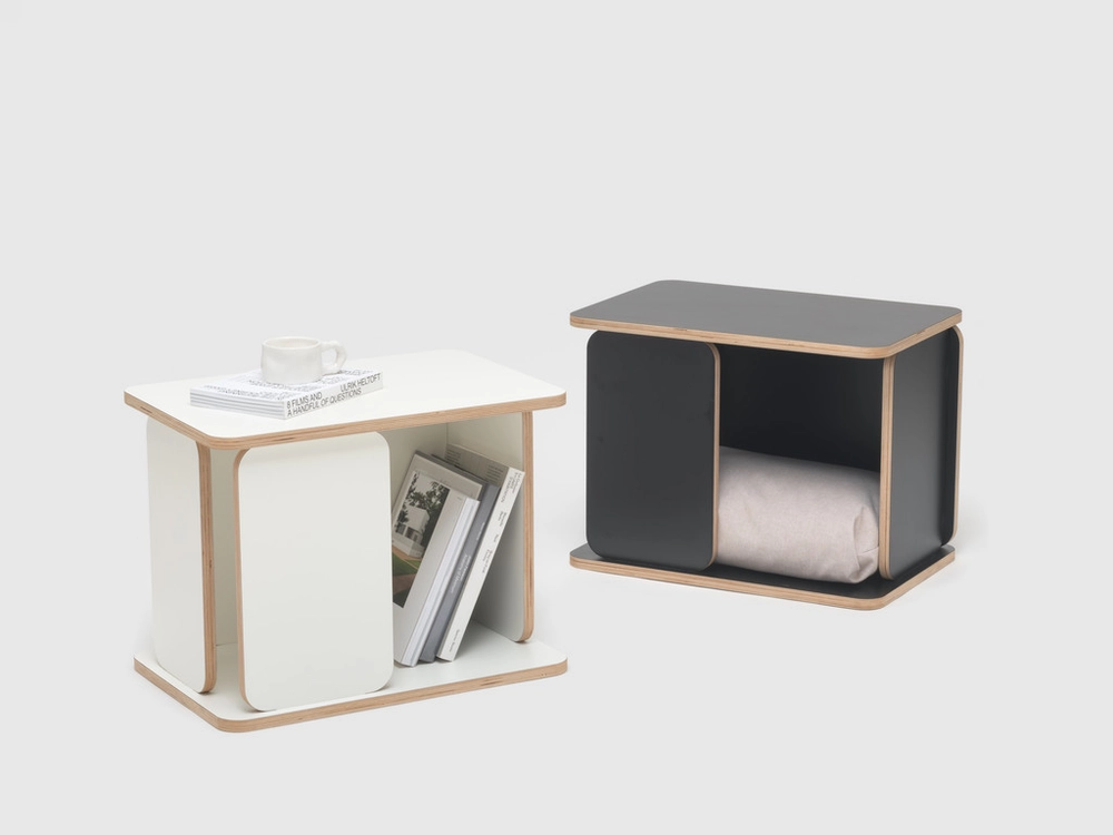 Share House is a multi functional furniture for both pets and pet owners. It is designed to share everyday life with loving companions. Share House can be a home with a soft cushion for your pets, and it can also be used as a side table or a shelf for you. A small gap on the side of the furniture allows you to make eye contact with the pets. With its minimalist design, the Share House blends perfectly into anywhere. It is made with plywood and HPL Film to reduce risks of contamination or damage. The edges are rounded for the safety of pets.