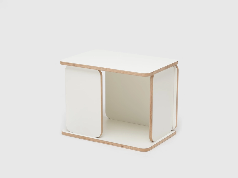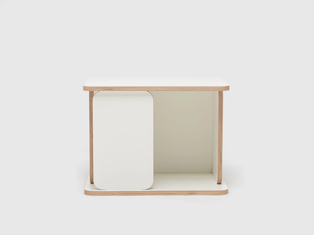 "반려동물과 반려인이 함께 사용할 수 있는 가구는 없을까?" 라는 고민에서 시작되어 완성된 가구입니다. 반려동물과 소중한 공간을 공유하여 반려인과 반려동물의 유대감이 한층 더 깊어지길 의도했습니다. 때로는 반려동물의 집이 되기도, 때로는 반려인의 사이드 테이블이나 선반으로 사용 가능한 가구입니다. 가구 측면의 작은 틈을 통해 반려동물과 눈을 마주칠 수 있도록 설계되었습니다. 합판과 HPL Film을 사용하여 오염 및 파손 우려가 적으며, 반려동물의 안전을 위해 모서리가 둥근 형태로 제작되었습니다.